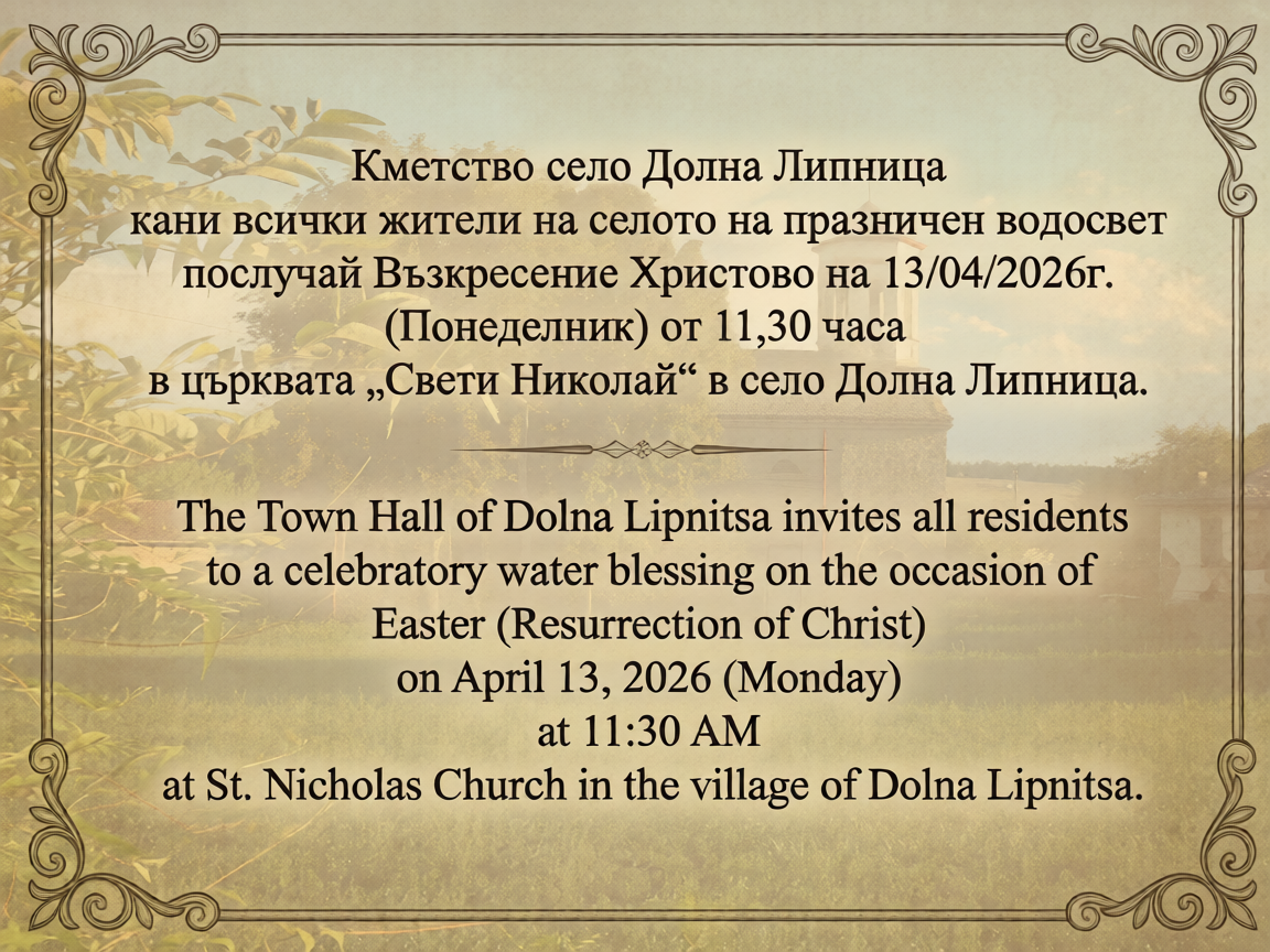 The Town Hall of Dolna Lipnitsa invites all residents to a celebratory water blessing on the occasion of Easter (Resurrection of Christ) on April 13, 2026 (Monday) at 11:30 AM at St. Nicholas Church in the village of Dolna Lipnitsa.